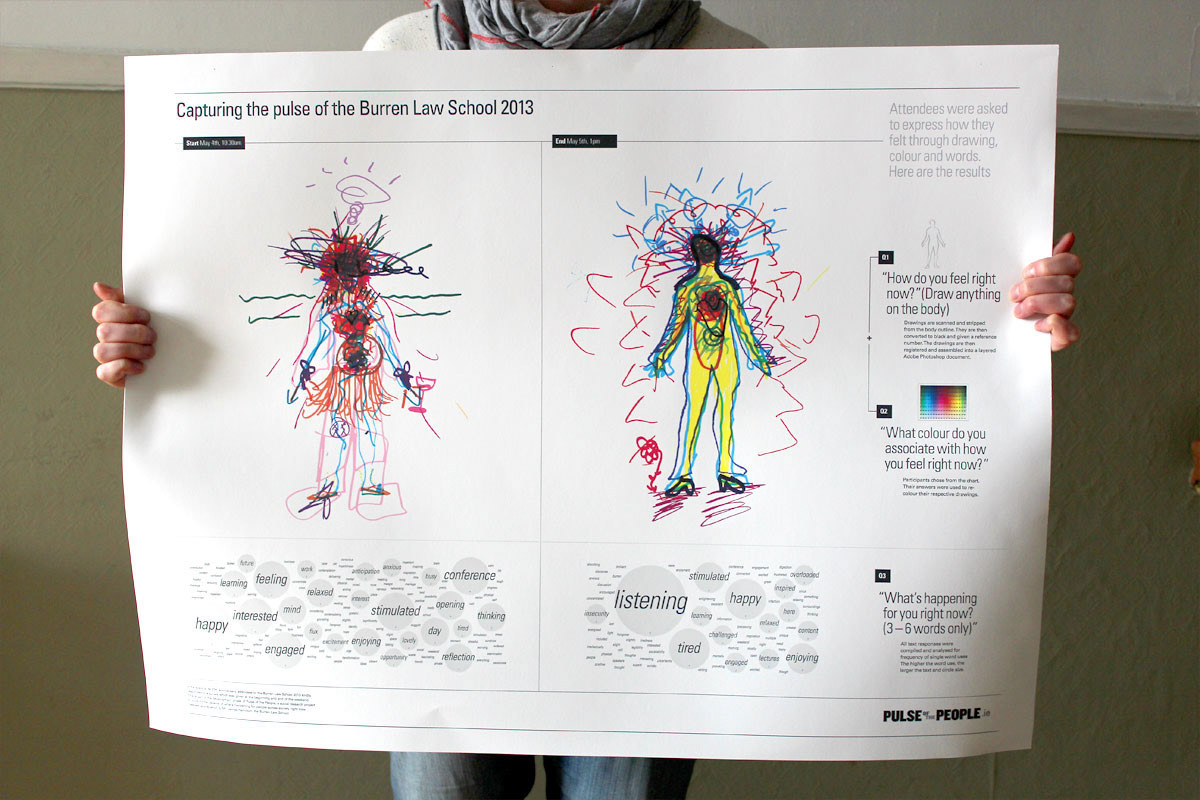 Pulse of the People began with a conversation with Niamh Gunn. We are asking “What’s happening in Irish people’s hearts right now?” A pilot survey with 150 students in Cork, testing questions around courage, hope, understanding, wishes and feelings. We then tested the survey on a highly rational and intellectual cohort attending a law conference, May 2013. Could they respond to questions around colour, feeling and the body? Results are in the form of drawings, colour choices, word statements and stories. We have extended this research across a selected range of groups at a well-being centre in West Cork. Data visualisation methods compare results by gender, age, location and groups. pulseofthepeople.ie